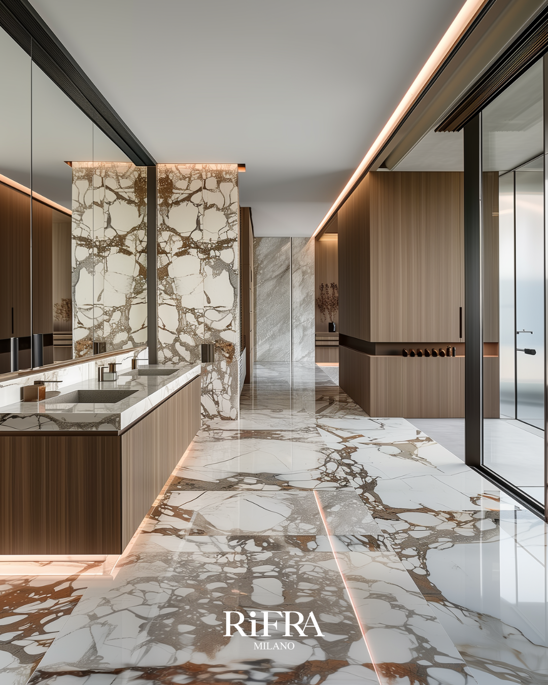 Our new RiFRA project embodies contemporary and luxurious design, characterized by clean, minimalist lines. The interiors feature high-quality materials such as marble and fine wood, and a color palette ranging from neutral to dark tones. Large windows allow natural light to flood the spaces, creating a sense of continuity with the outside and highlighting the exquisite finishes.