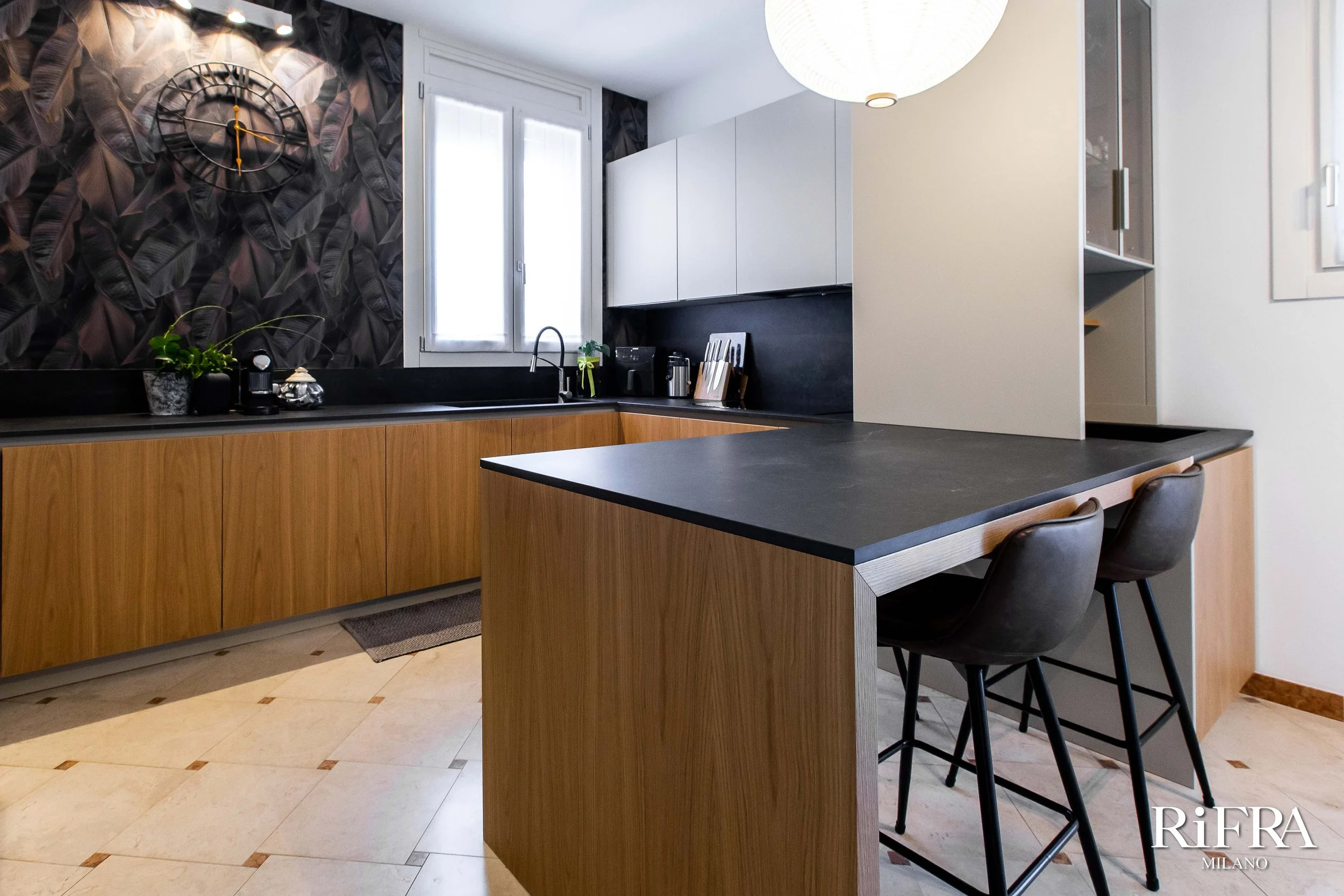 The RiFRA kitchen featured in this realization is a LINE with peninsula, which presented several challenges to solve.
