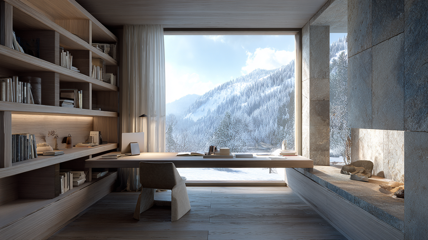 Brushed woods, raw stones, and glass converse with the absolute white of the landscape, shaping interiors where the fireplace becomes the vital center and the glazing erases boundaries.